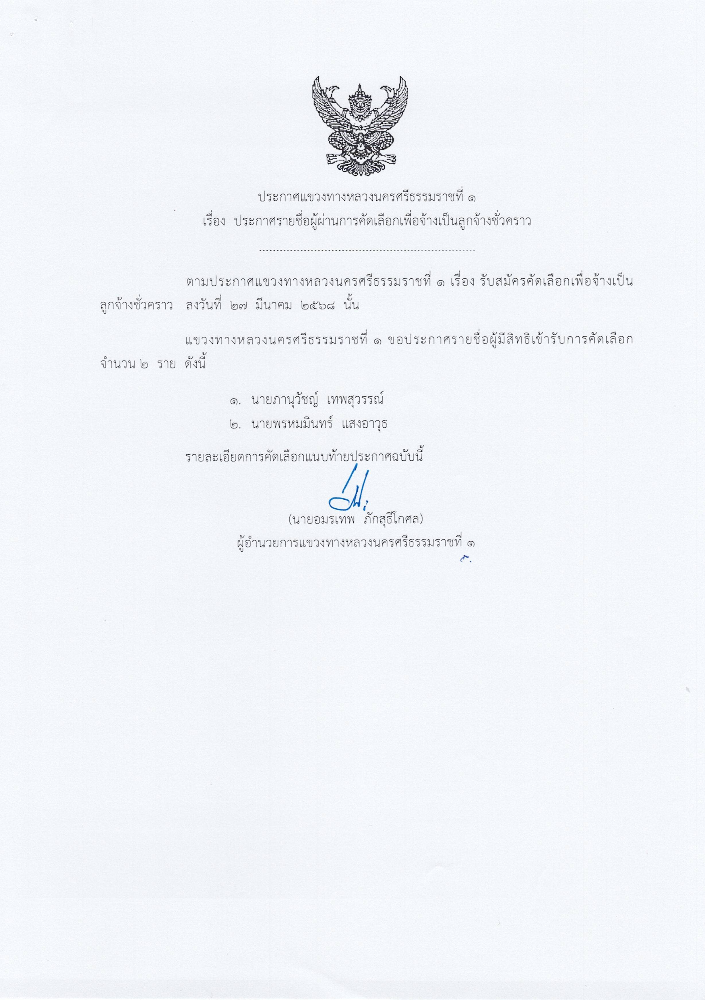 ประกาศรายชื่อผู้ผ่านการคัดเลือกเพื่อจ้างเป็นลูกจ้าง