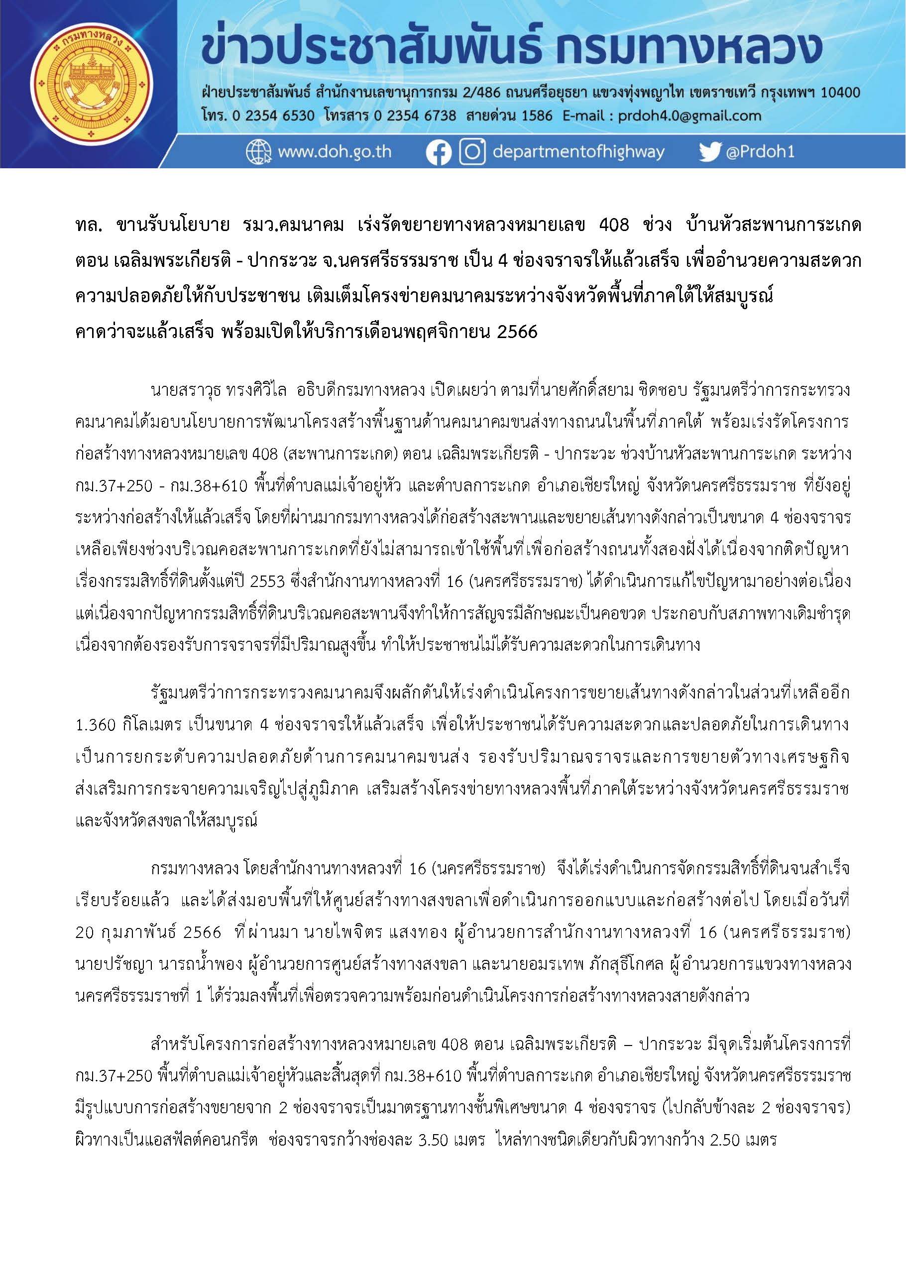ทล. ขานรับนโยบาย รมว.คมนาคม เร่งรัดขยายทางหลวงหมายเลข 408 ช่วง บ้านหัวสะพานการะเกด ตอน เฉลิมพระเกียรติ - ปากระวะ จ.นครศรีธรรมราช เป็น 4 ช่องจราจรให้แล้วเสร็จ เพื่ออำนวยความสะดวกปลอดภัยให้กับประชาชน เติมเต็มโครงข่ายคมนาคมระหว่างจังหวัดพื้นที่ภาคใต้ให้สมบูรณ์ คาดว่าจะแล้วเสร็จพร้อมเปิดให้บริการเดือนพฤศจิกายน 2566