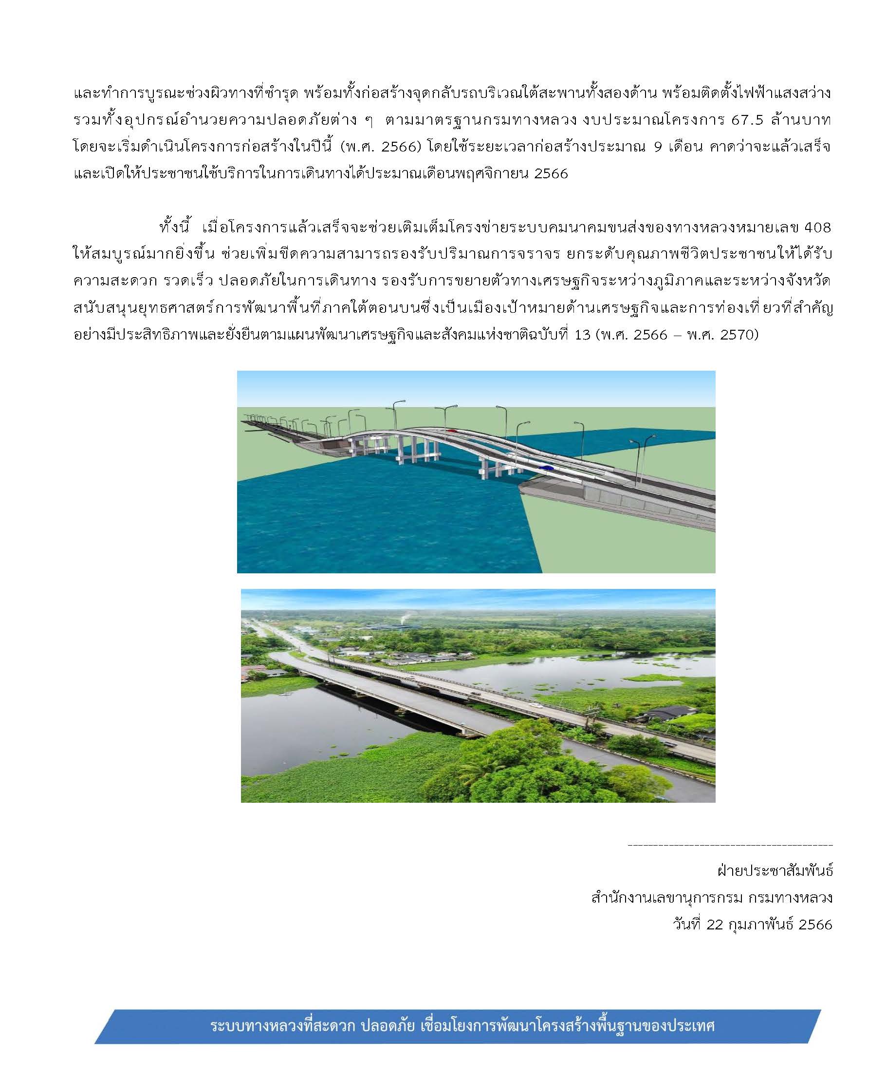 ทั้งนี้ เมื่อโครงการแล้วเสร็จจะช่วยเติมเต็มโครงข่ายระบบคมนาคมขนส่งของทางหลวงหมายเลข 408 ให้สมบูรณ์มากยิ่งขึ้น ช่วยเพิ่มขีดความสามารถรองรับปริมาณการจราจร ยกระดับคุณภาพชีวิตประชาชนให้ได้รับความสะดวก รวดเร็ว ปลอดภัยในการเดินทาง รองรับการขยายตัวทางเศรษฐกิจระหว่างภูมิภาคและระหว่างจังหวัด สนับสนุนยุทธศาสตร์การพัฒนาพื้นที่ภาคใต้ตอนบนซึ่งเป็นเมืองเป้าหมายด้านเศรษฐกิจและการท่องเที่ยวที่สำคัญอย่างมีประสิทธิภาพและยั่งยืนตามแผนพัฒนาเศรษฐกิจและสังคมแห่งชาติฉบับที่ 13 (พ.ศ. 2566 – พ.ศ. 2570)