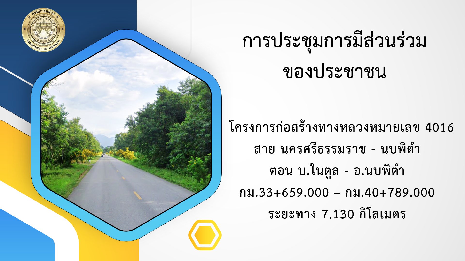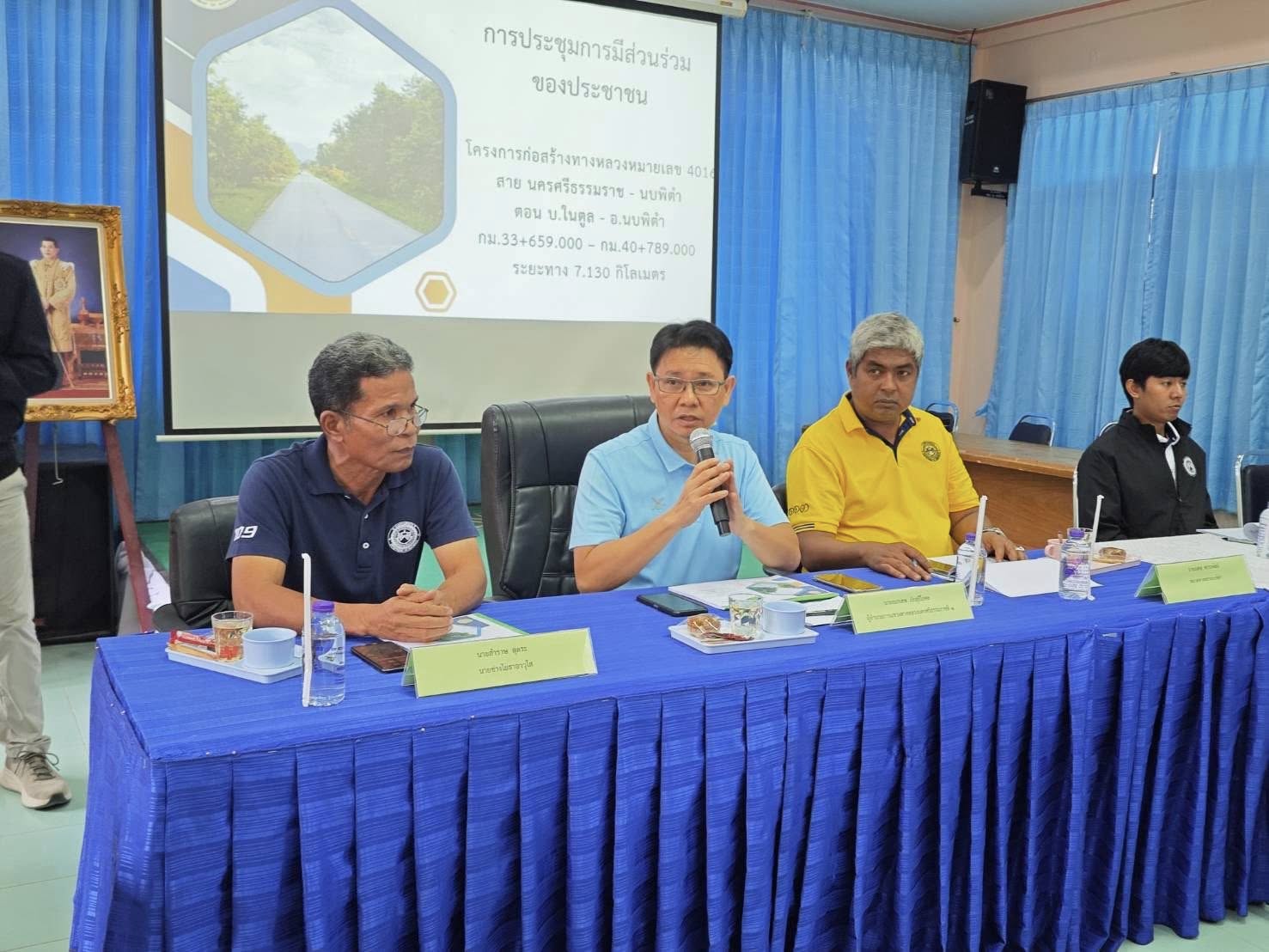 วันพุธที่ 28 พฤษภาคม 2568 เวลา 09.30น. นายอมรเทพ ภักสุธีโกศล ผู้อำนวยการแขวงทางหลวงนครศรีธรรมราชที่ 1 พร้อมเจ้าหน้าที่ ร่วมประชุมการรับฟังความคิดเห็นและการมีส่วนร่วมของประชาชน โครงการก่อสร้างทางหลวงหมายเลข 4016 สาย นครศรีธรรมราช - อ.นบพิตำ ตอน บ.ในตูล - อ.นบพิตำ ระหว่าง กม.33+659 - กม.40+789 ระยะทาง 7.130 กิโลเมตร โดยมีหน่วยงานภาครัฐ เอกชน ผู้นำท้องถิ่น ประชาชนในพื้นที่ และผู้ใช้เส้นทาง เข้าร่วมประชุม ณ เทศบาลตำบลนาเหรง ต.นาเหรง อ.นบพิตำ จ.นครศรีธรรมราช ( มติที่ประชุม เห็นด้วยให้มีการก่อสร้าง )